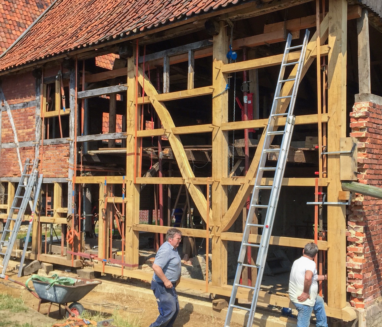 Die Langlebigkeit traditioneller Fachwerkbauten ist legendär. Die ältesten in Deutschland existierenden kommen auf über 800 Jahre. Das sind unsere Vorbilder. Verpönt bei uns sind Blechverbindungen. Zapfen, Zapfenloch und Holznagel gehören bei uns zur standardmäßigen Holzverbindung, die nach wie vor für Langlebigkeit stehen. So ist es selbstverständlich, dass Reparaturmaßnahmen an historischen Bauten in der gleichen Weise wie ihre Vorbilder ausgeführt werden.