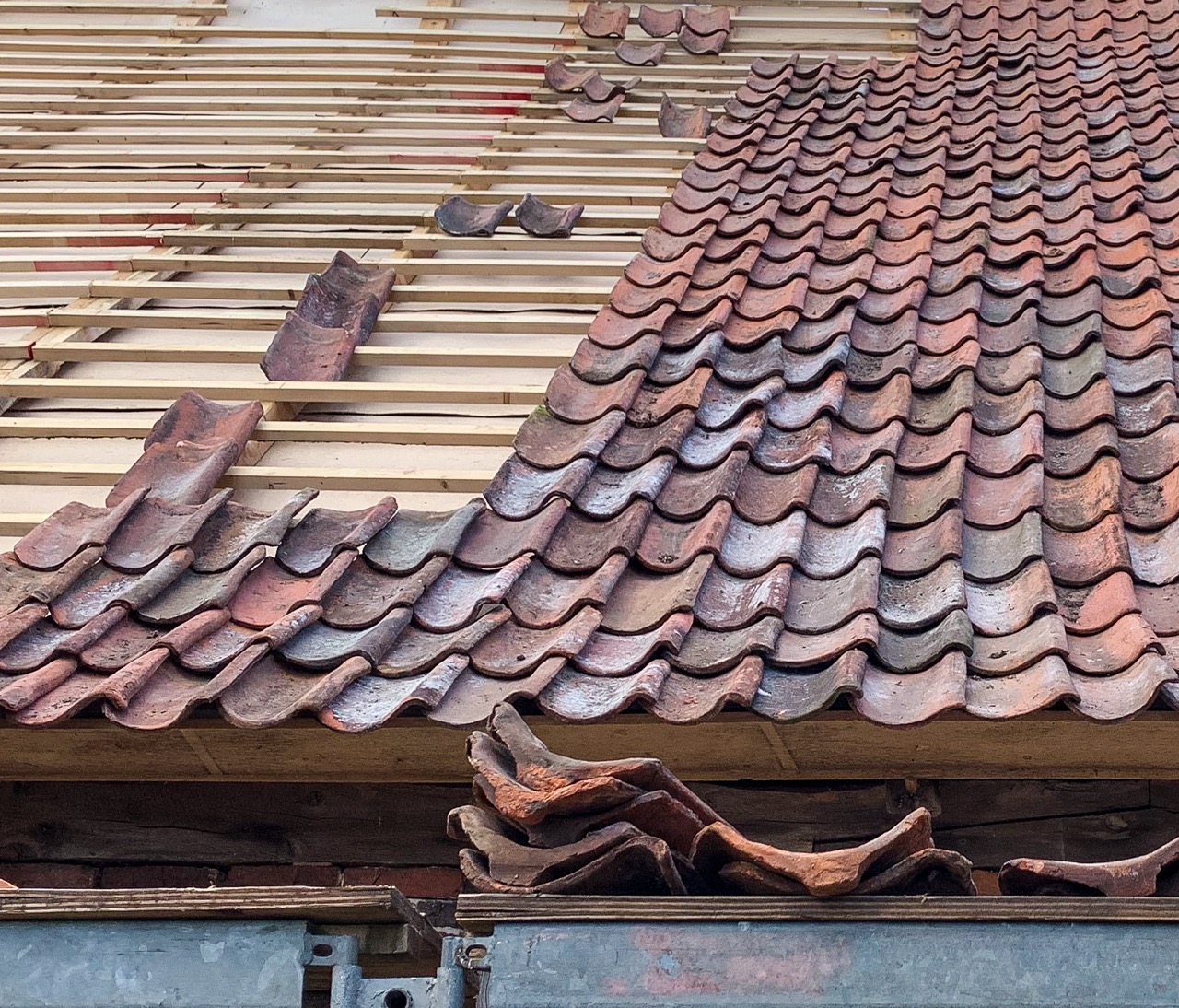 Alte Hohlpfannen zeigen auch heute noch, wie beständig das früher aufwändigen hergestellte Dachdeckungsmaterial ist und daher wiederverwendet werden kann. Aber dazu braucht man spezialisierte Dachdecker, die das Verlegen noch können, insbesondere dann, wenn das Dach keine regelmäßigen Flächen zeigt.